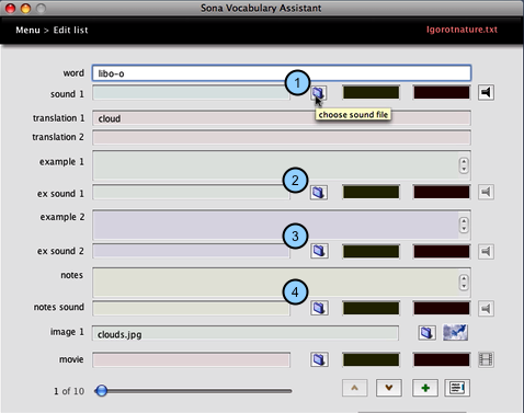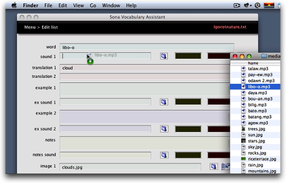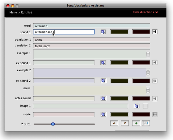 Click the "sound 1" field and type into it to link a sound with the target word. To link a sound with one of the examples, or with notes on usage, type into the "ex sound 1," "ex sound 2," or "notes sound" fields.